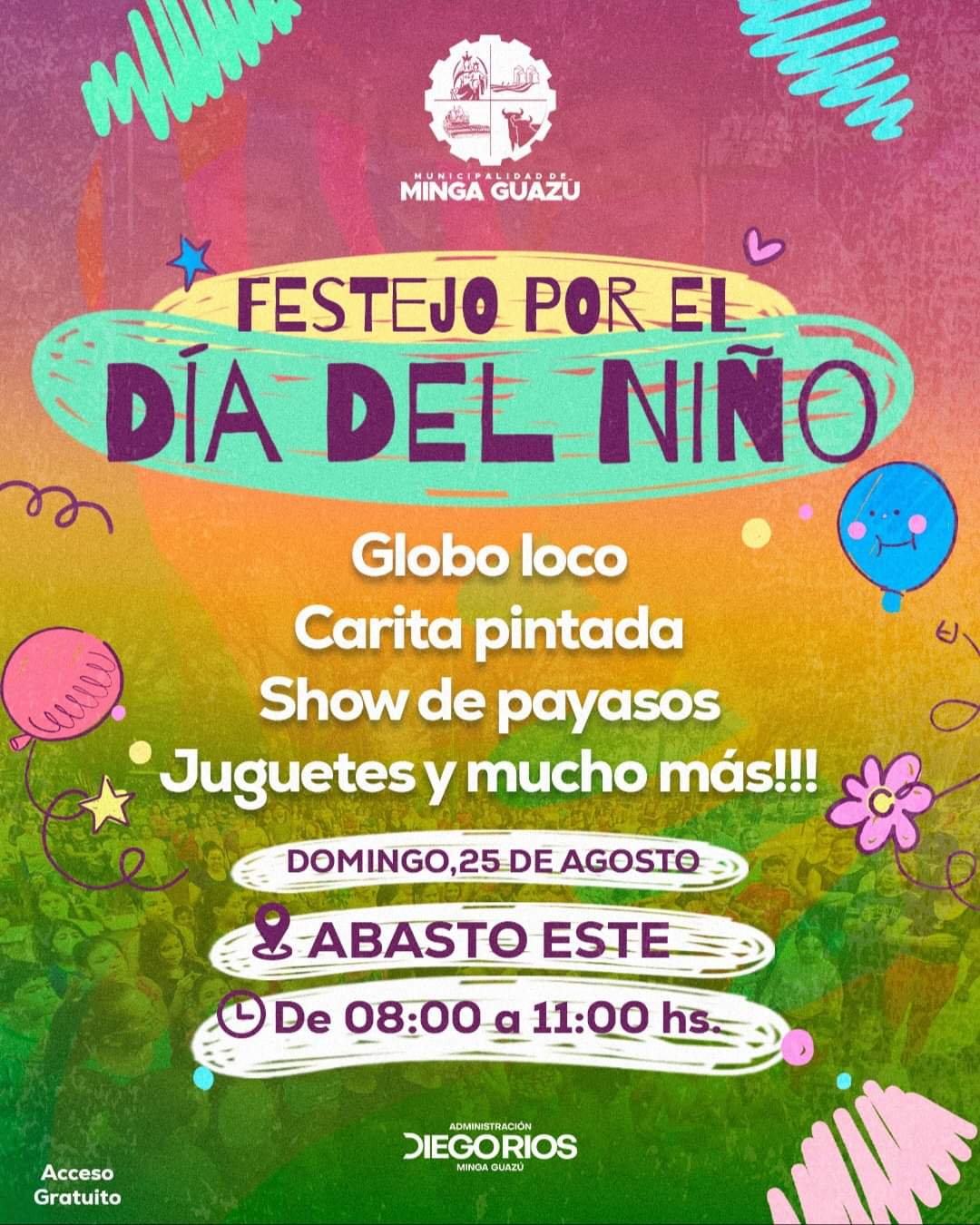 Este domingo 25 de agosto a las 8:00 a 11:00a.m., la administración Diego Ríos de Minga Guazú llevará a cabo una gran celebración en Abasto Este para festejar el Día del Niño. El evento promete una mañana llena de alegría y entretenimiento para los más pequeños, con actividades que incluyen «globo loco», caritas pintadas, un divertido show de payasos, juguetes y muchas sorpresas más.